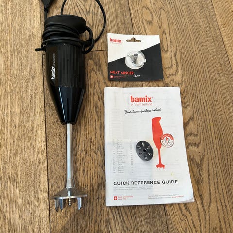Bamix M200 stavblender med 200 W motor. Håndholdt stavblender i rød farve med grå grebsflader og spiralformet ledning. Blenderfoden og knivdelen er i metal. Velegnet til blendning og purering af mad og drikke i køkkenet. Modellen er mærket med 200 V / 200 W og er fremstillet i Schweiz.