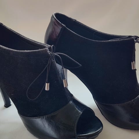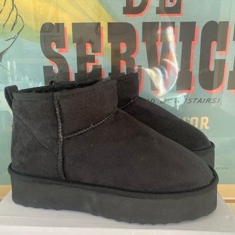 Et par super højhælede plateaustøvler fra NLY i størrelse 41. De har en høj hæl på ~15,5 cm med en plateau på ~6,5 cm og snørebånd foran, så de kan fastgøres ordentligt til foden. De har også en lynlås på indersiden og en rem omkring anklen med gulddetaljer. Plateausålen er mere 'chunky' og lavet af gummi, hvilket også gør dem nemmere at gå i, da de ikke er glatte som mange højhælede med en glat sål kan være. De er brugt et par gange og har et par skrammer og små tegn på slid, som vist på billederne, men de ser stadig rigtig flotte ud, og intet af det er noget man bemærker, når man har dem på. Kommer i den originale æske.