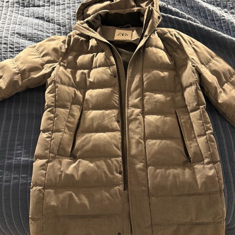Zara vinterjakke til herre i størrelse L. Jakken er sort og foret med dun, hvilket giver god isolering i koldt vejr. Modellen har hætte og gennemgående lynlås med knaplukning. Foran er der sidelommer med lynlås. Velegnet som yderjakke i vinterhalvåret.