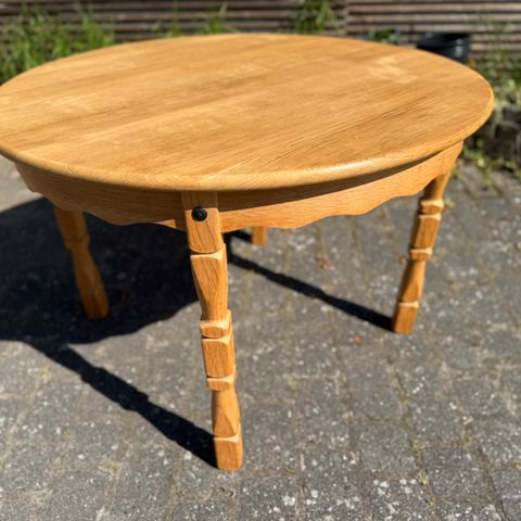 Gammel massivt egetræ spisebord fra Rosengaarden. Der er desværre ingen indskudsplader til. Dem må du selv fikse. Derfor 1600kr. Mål; 120 dia 74 høj. Udtræk 135 lang