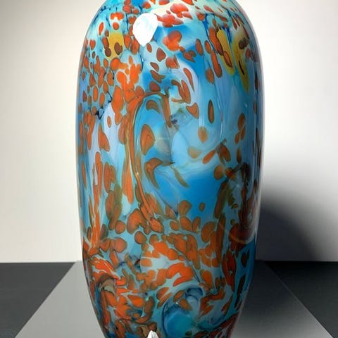 Dekor med en baggrundsblære af blæst, transparent cobaltblå, opaliner og degraderede farver i glasets masse.