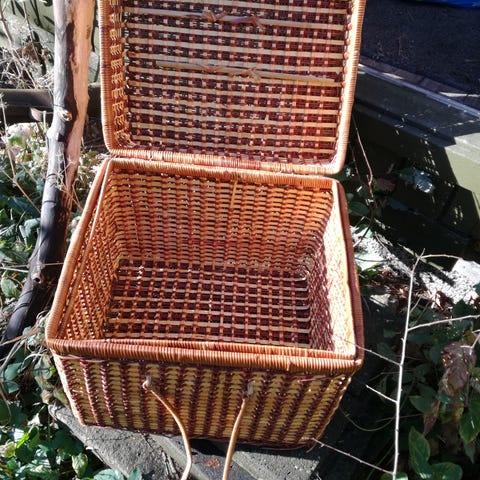 Optima Luxe picnickurv af rattan, oprindelse Kongeriget Storbritannien, cirka 2010–2020, mål 46 x 32 x 34 cm, i god brugt stand med enkelte ældre brugsspor, komplet med bestik, tallerkener og krus i skotskternet mønster. Klik på den blå "gå til varen" knap, for at købe eller byde på denne vare. Den samlede pris vil blive vist inden du afgiver dit bud.