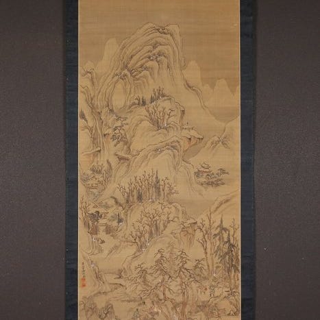 Et håndmalet maleri med pigmenter på silke, der skildrer et idyllisk landskab med en figur.