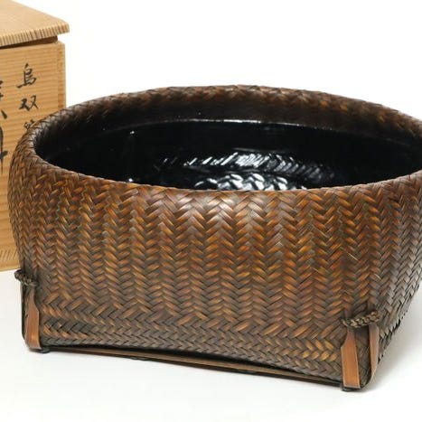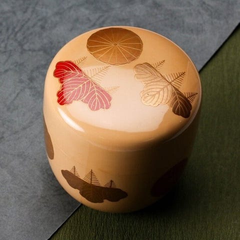 Denne forfinede lakboks til te fra Sōhō (宗芳) eksemplificerer elegancen i traditionel japansk maki-e-kunst. Gennemført i en varm karminrød lak, er overfladen prydet med fine gyldne motiver, der viser risstrå, flyvende fugle og en hængende votivplade, motiver forbundet med høst, velstand og sæsonbestemte velsignelser. Den afrundede form ligger behageligt i hånden, og den blanke finish afslører dybde og blødhed opnået gennem omhyggelige lag af lak. Medfølgende sin originale underskrevne træboks, afspejler dette stykke både funktionel skønhed og poetisk symbolik, hvilket gør det til et betagende objekt for teceremonien og et fremragende