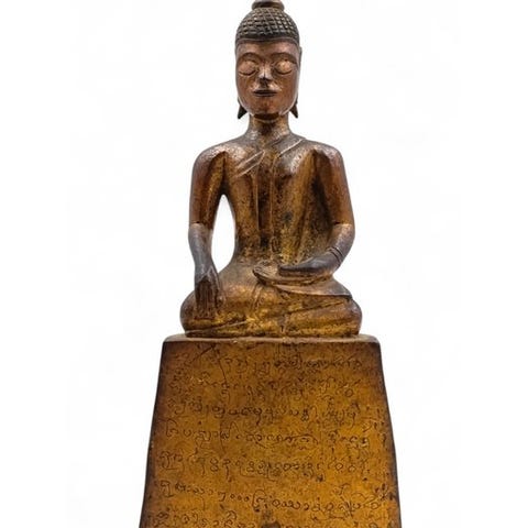 Shakyamuni Buddha i Bhumisparsha-mudra, udhugget i træ og forgyldt, Thailand, midten af det 20. århundrede, mål 19 cm høj, 15 cm bred, 8,5 cm dyb, provenance privat samling, i god stand. Klik på den blå "gå til varen" knap, for at købe eller byde på denne vare. Den samlede pris vil blive vist inden du afgiver dit bud.