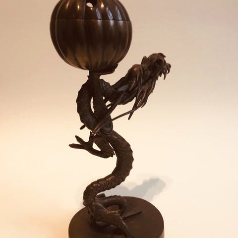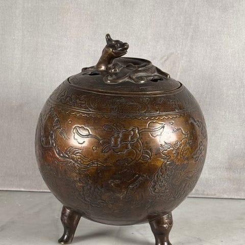 Patineret bronzekoro i firkantet form til røgelse fra Meiji-perioden, Japan, ca. 1850–1900, højde 28 cm, bredde 20 cm, dybde 20 cm, vægt 2,8 kg, i god stand med små tegn på ælde og to forben limet næsten usynligt. Klik på den blå "gå til varen" knap, for at købe eller byde på denne vare. Den samlede pris vil blive vist inden du afgiver dit bud.
