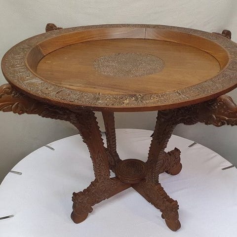 Indisk sandeltræs skakspil med bord og kæmpe låsefæller og figurer udskåret i Rajasthan med jagttemaet Mahar Jahs; kongen er 6 cm høj, bordet er 38 cm højt og 36 cm i diameter, opbevaret i en farverig kuffert, alle brikker og bordet i fremragende stand, cirka 1960–1970, oprindelse Indien. Klik på den blå "gå til varen" knap, for at købe eller byde på denne vare. Den samlede pris vil blive vist inden du afgiver dit bud.