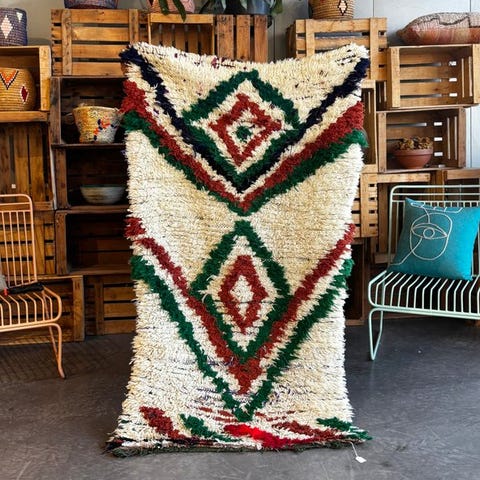 Dette antikke marokkanske Boujad-tæppe stammer fra Boujad-regionen i det centrale Marokko og daterer sig fra 1960'erne til 1970'erne. Håndvævet af naturligt fåreskind, skiller dette stykke sig ud med sit dristige monokrome udtryk og forfinede tribal enkelhed.