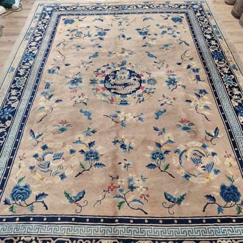 China Art Deco tæppe af kinesisk oprindelse, uld på bomuld, størrelse 273 x 225 cm, fremstillet i det 21. århundrede, professionelt renset og generelt i god stand. Klik på den blå "gå til varen" knap, for at købe eller byde på denne vare. Den samlede pris vil blive vist inden du afgiver dit bud.