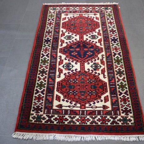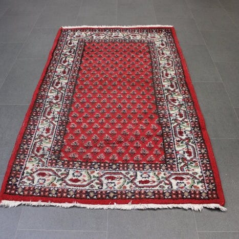 Indisk håndknyttet tæppe af uld på bomuld, 138 x 70 cm, rødt og sort, ca. 90.000 knuder, vævet i 1980-1990, i god stand. Klik på den blå "gå til varen" knap, for at købe eller byde på denne vare. Den samlede pris vil blive vist inden du afgiver dit bud.