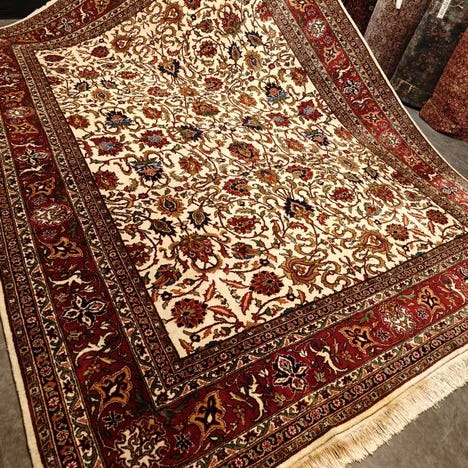 Oprindelse Indien; Model Tabriz; Mål 245 × 169 cm; Materiale: uld på bomuld; Knudetal ca. 160.000; Pilehøjde ca. 4–6 mm; Farver beige og brun; Generelt god stand med brugsspor; fremstillet i slutningen af det 20. århundrede (1980–1990). Klik på den blå "gå til varen" knap, for at købe eller byde på denne vare. Den samlede pris vil blive vist inden du afgiver dit bud.