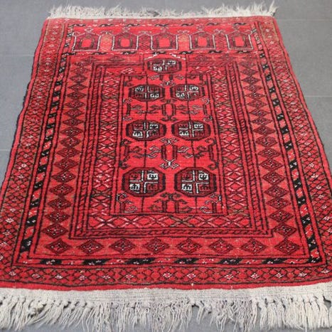 Oprindelse: Indien; Navn: Yalameh; Mål 160 × 90 cm; Håndknyttet; Uld på bomuld; Farver rødt og hvidt; Alder ca. 1980–1990; Knuder ca. 90.000; Tilstand: I meget god stand. Klik på den blå "gå til varen" knap, for at købe eller byde på denne vare. Den samlede pris vil blive vist inden du afgiver dit bud.