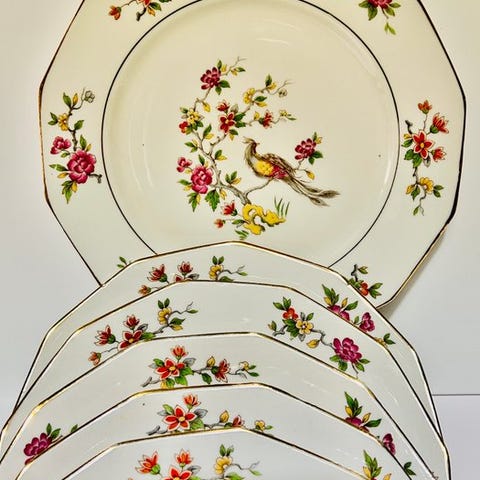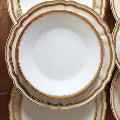 Disse tallerkner udmærker sig ved deres raffinerede chantourné-form, der er emblem for Limoges-håndværket, og ved en fin guldbelægning langs kanten, som tilføjer et strejf af elegance og noblesse til hele sættet. Deres enkle og tidløse design passer både til et klassisk bord og til en mere moderne indretning.