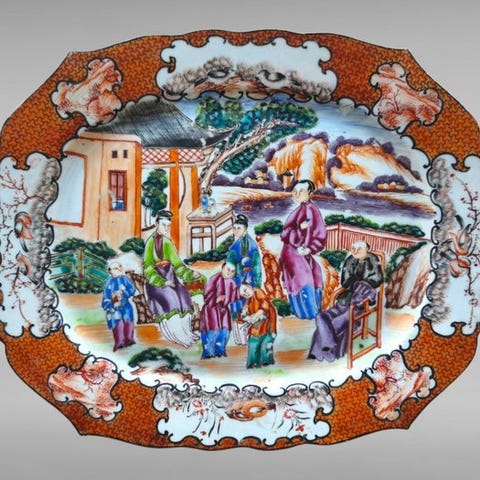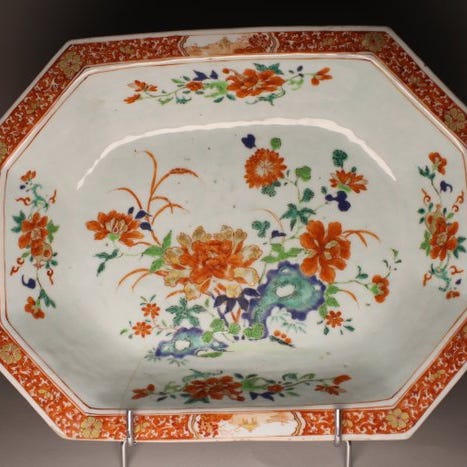 En oval serveringsplatte af kinesisk eksportporcelæn fra Det Ostindiske Kompagni, i ottekantet form, dekoreret med emaljer fra rosa-familien på hvid glasur.