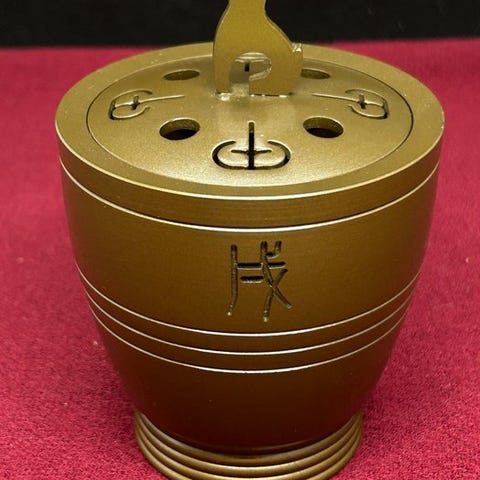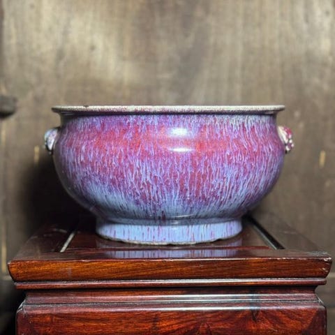 Jeg deler med dig denne skønne polykrome røgelsesbrænder i større størrelse. Underglasur blå og overglasur andre emaljer. Med en fortsat scene af blomsterpotter, dyr og forskellige slags genstande.