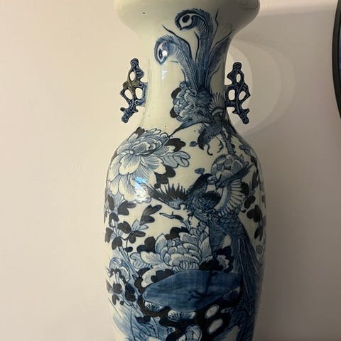 Porcelænsvase i lyse, pudderblå, ensfarvet, Qing-dynastiet (1644–1911), ca. 1700–1750 til 1750–1800, colbeskåret hals, blå cirkel under bunden; mål 41 x 20 x 17 cm, vægt 2,960 kg, oprindelse privat samling, i god stand med nogle brugsspor og alderstegn. Klik på den blå "gå til varen" knap, for at købe eller byde på denne vare. Den samlede pris vil blive vist inden du afgiver dit bud.