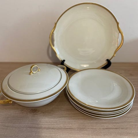 Limoges porcelænsservice i renæssancestil med et smukt Fragonard-design indvendigt og kanter i blændende guldbroderi.
