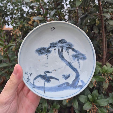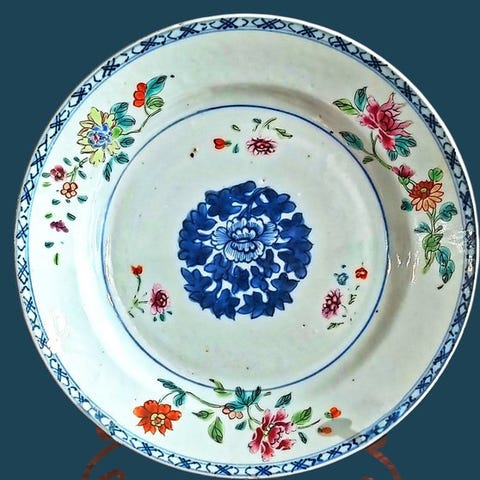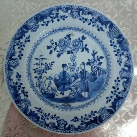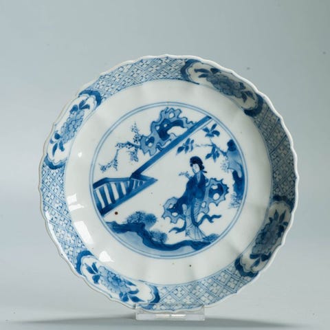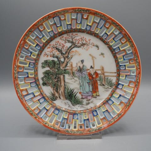 Imari-dekorationen i blåkobaltfarvet, jernrød og guld, der centralt viser en udsigt over en have, Qing-dynastiet, Qianlong-perioden (1736-1795). Med små skader på kanten. Diameter: 23 cm.