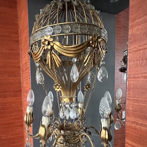 Et eksklusivt, dekorativt lysekrone i det pragtfulde Empire-stil – fremstillet af smedejern i guld med håndarbejdede, fine porcelænsblomster. Fremstillet i filigran-design af håndsmedet metal. Denne enestående lampe kombinerer floral elegance med kunstfærdigt håndværk og er et sandt højdepunkt for samlere eller entusiaster af klassisk indretning til eksklusive interiører eller
