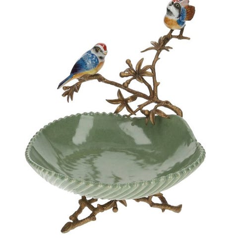 En porcelænskål med bronzebrud ornamenter og en bronzep Paradijsfugl, i fremragende stand fra perioden 2010-2020, fremstillet i Europa; mål: 35 cm bred, 20 cm dyb, 15 cm høj. Klik på den blå "gå til varen" knap, for at købe eller byde på denne vare. Den samlede pris vil blive vist inden du afgiver dit bud.