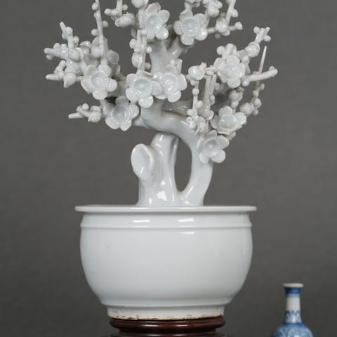 En smuk antik kinesisk porcelænskulptur i Blanc de Chine, der forestiller plommetræer med blomster i en smukt formet jardinière. Udført i en smuk ensfarvet hvid glasur. Håndlavet i det ældgamle kejserlige Kina, Dehua-kilnerne i Fujian-provinsen, under Qing-dynastiet, Kangxi-perioden (ca. 1700). I bunden en smukt udhugget base, der viser alder og materiale. Garanteret original og fra den angivne periode.