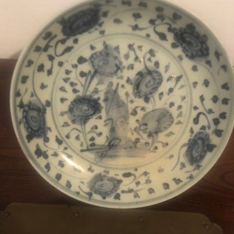 En smuk, udsøgt dekoreret tallerken i en lys koboltblå farve, fremstillet til det japanske marked i slutningen af Ming-dynastiet, i overgangsperioden (1620-1640). Selvom der blev produceret forskellige designs til kinesisk eksport til forskellige markeder, mener jeg, at dem til japansk eksport er de mest interessante. Hver del af tallerkenen bærer en symbolik, som ikke blev fortolket i Europa, men fandt fortolkning i lande som Japan, Korea, Vietnam og selve Kina. Selvom det er sandt,
