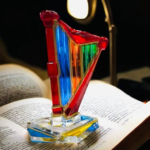 Musikinstrument udført med hånddekoreret glas med farvede emaljer i overensstemmelse med Murano-dekorerernes teknik.