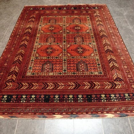 Smukt håndvævet tæppe af uld. Katoenen er naturligt farvet uden kemikalier. Hovedfarverne er rød, creme og sort. Tæppet er med en smuk, professionel og stram vævning, og det har korte frynser.