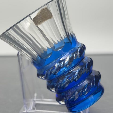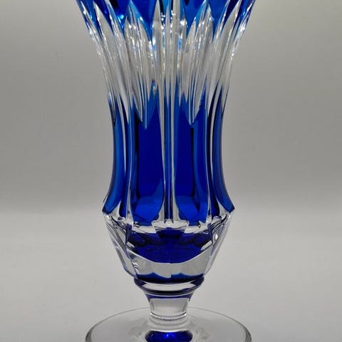 En tung konisk skåret krystalglasvase med bølget kant, udført i blå og klart glas, cirka 15 cm høj og vejer 1687 g, mærket med VSL-mærke på siden og underskrevet Val St. Lambert, graveret på undersiden.