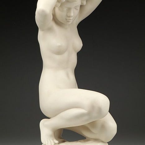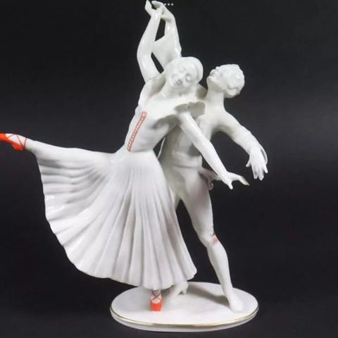 Stor Hutschenreuther porcelænsfigur faset 'Para Łabędzi' af Hans Achtziger, Tyskland, ca. 1930–1940, mål 32 cm bred, 30 cm dyb og 33 cm høj, i god brugt stand med mindre alderstegn. Klik på den blå "gå til varen" knap, for at købe eller byde på denne vare. Den samlede pris vil blive vist inden du afgiver dit bud.