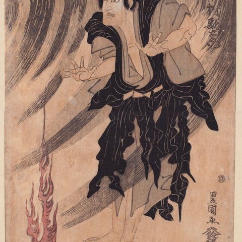 Originalt japansk træsnit - Utagawa Kuniyoshi (1796-1861), der forestiller de 108 helte fra Suikoden. Udgave i 1830 af Kagaya Kichiyemon. Med uret fra toppen; Konseimaô Hanzui med hænderne magisk sammenknyttede og udsendende lys; Hitendaisei Rikon støttende sig til skaftet af sit våben; Tettekisen Barin sidder i rustning; Shô-onkô Ryohô sidder; med en speer; Hakujisso Hakushô bøjer bambus til en bue; Saijinki Kwakusei med en speer og en vægtet snor; Tetsubihaku Saifuku sidder, med et buet bambus; Itsushikwa Saikei sidder, trekvart bagfra; og Hatsubinada Kôjû, halvnøgen, der holder et sværd