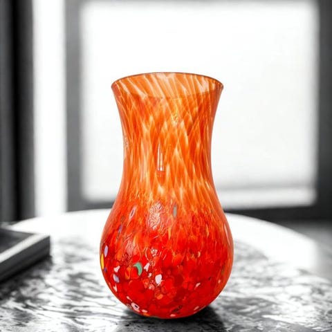 I dag præsenterer vi denne raffinerede glaskrukke, håndlavet af virksomheden MurArt i overensstemmelse med Murano-traditionen. Den kompakte og elegante form rummer en livlig orange bund, beriget af indslag af fragmenter af farvet glas i blå, grøn, gul, hvid og sort, som giver overfladen dybde og bevægelse.
