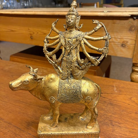 Stor Shiva Nataraja i forgyldt bronze, 72 × 57 cm, oprindelse Indien, andet halvdel af det 20. århundrede, original, i god stand, fra privat samling. Klik på den blå "gå til varen" knap, for at købe eller byde på denne vare. Den samlede pris vil blive vist inden du afgiver dit bud.