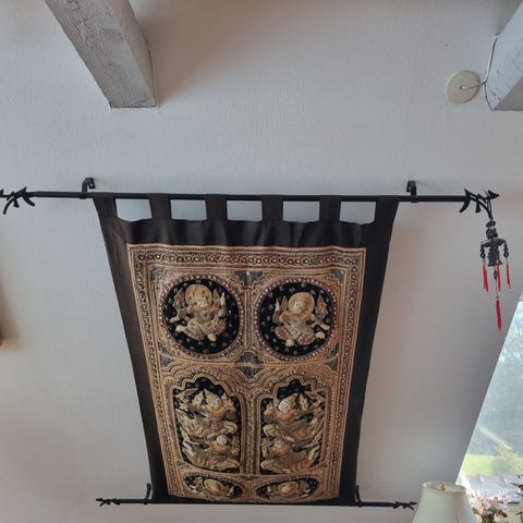 Sjældent turkmensk Tekke Kapunuk – dør- eller teltindgangsdekoration med lange, snoede frynser. Det U-formede vævede tæppeafsnit er udført i fast og fint væv i den typiske turkmenske stil. De to sider løber spidse ud. Øverst er der faste ophængningsløkker på begge sider. På de to sider er der 10 og 12 bundne kædefibre, viklet med sort og rød uld. Der hænger to sorte frynser og en rød endefrynse (ikke alle fuldstændigt) samt hver med en turkis/blå perle på næsten 14 mm i diameter. I gennemgangsområdet er der 35 bundne kædefibre, viklet med sort og rød uld, med røde og sorte frynser, også pyntet med perler. Meget detaljeret vævet og dekoreret Kapunuk. En nederste frynse mangler. I midterdelen er en frynse forkortet, og ved to frynser (en kort og en lang) er viklingen beskadiget. Ideel som rumdeler eller i en dørkarm.