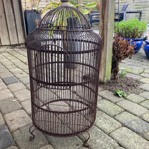 Det drejer sig om et smukt brocante smedejern fuglebur. Perfekt til haven eller i haveværelset, verandaen. Toppen kan åbnes, og døren kan åbnes, begge med fine låse.