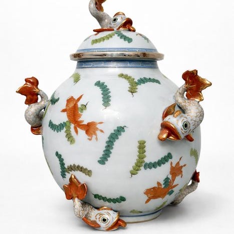 Porcelæn, farvet og forgyldt, vægge med fine og brede gyldne kanter, lyspurpur og turquoise rocailler, låg med en kroneomkranset kartusche båret af to børn, låg, baluster, fod og sokkel med store plastiske blomstergrene, 4 siddende børn med blomster i hænderne, forreste del farverigt malet parklandskab med et Watteau-par foran, krone, her og på fod to børn med blomsterkranse i hænderne, bagsiden stort blomsterbukket, få blomster og blade let stødt, Sächsische Porzellan-Manufaktur Dresden, underglasurblåt mærke.