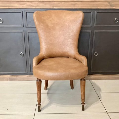 Strukturen er solid og hviler på elegante ben i mørkt træ med firkantet tværsnit. Profilen er helt afsluttet med håndsatte beslag i brunet metal, der understreger de klassiske og håndværksmæssige linjer. Sædet er bredt og komfortabelt, perfekt til et læsehjørne eller et prestigefyldt kontor. Læderet har en smuk naturlig patina, der vidner om dets ægthed og vintage charme.