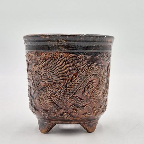 Håndmalet keramisk bonsai-pot med formel opret vækststil og et orientalsk dragemotiv, lavet i Italien; træets højde 12 cm, pottehøjde 13 cm, pottebredde 12 cm, pottefulde 13 cm. Klik på den blå "gå til varen" knap, for at købe eller byde på denne vare. Den samlede pris vil blive vist inden du afgiver dit bud.