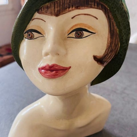 Keramisk skulptur i Georges Jouve-modellen 'Petite femme à nichons', Frankrig, anslået periode 1910–1964, 21 cm høj, 10 cm bred, 9 cm dyb, i god brugt stand med mindre tegn på alder og imperfektioner, helt solid uden brud eller reparationer, glasurer med dybblå base og farver i håret, sort satinlakeret torso med ensartet tone, mindre slidmærke ved den nedre kant, indvendigt med oprindelig keramikfinish, afsendes i en medfølgende plejeæske. Klik på den blå "gå til varen" knap, for at købe eller byde på denne vare. Den samlede pris vil blive vist inden du afgiver dit bud.