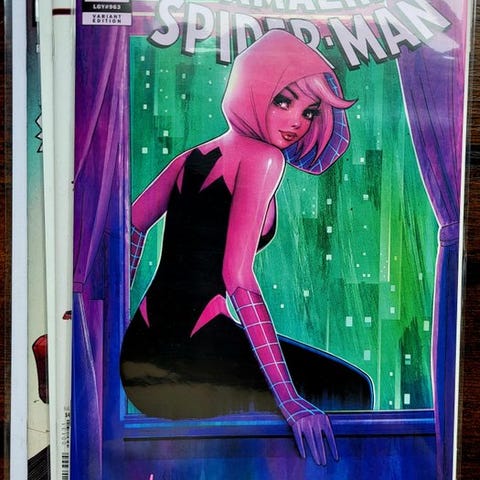 Lægge af 3 tegneserier signeret med COA, herunder Amazing Spider-Man #7 signeret af Zeb Wells og Edge of SpiderVerse #5 signeret af Dan Slott samt Spider-Man 2099, alle i Very High grade (TTB) med COA; ældste item fra 2024. Klik på den blå "gå til varen" knap, for at købe eller byde på denne vare. Den samlede pris vil blive vist inden du afgiver dit bud.