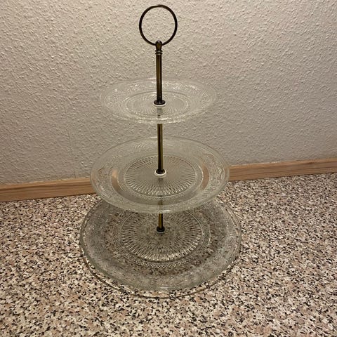 Etagefad i 2 lag i pink glas med mønstret dekoration. Øverste tallerken har en diameter på ca. 20 cm, nederste tallerken ca. 27 cm. Højden er ca. 23 cm målt til toppen af håndtaget. Metalstang i midten med bærehåndtag øverst. Velegnet til servering af kager, småkager, frugt eller andre små anretninger.