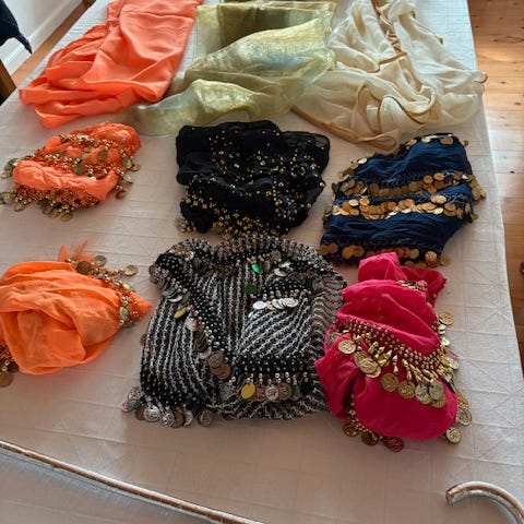 Dansetøj, Mavedans, str. Xl-XXL, Forskelligt mavedanserudstyr,bælter,slør,mm.