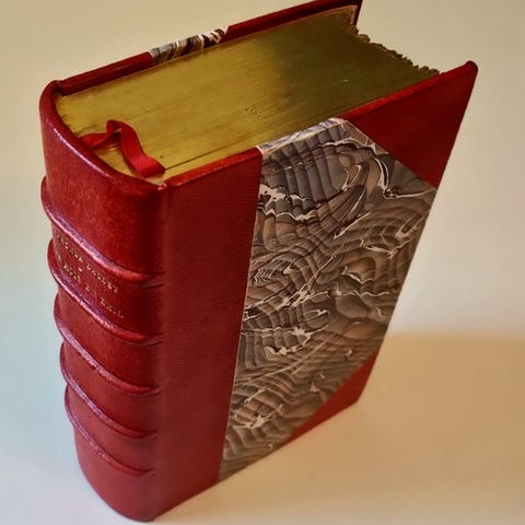 Bindingsrestaurering strengt tidsvarende (fuldt maroquinrødt med langt korn, ryg glat med markerede riller og gyldne hachurer, gyldne rosetter og gyldne konturer, titel i guld,