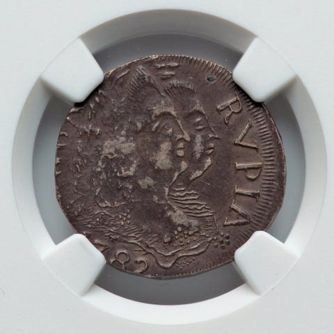 Sølvmønt fra portugisisk Indien, 2 Tangas (120 Reis), 1653 São João Goa, stand XF, vægt 3,93 g, diameter 18,70 mm, viser D. João IV (1640-1656), meget sjælden. Klik på den blå "gå til varen" knap, for at købe eller byde på denne vare. Den samlede pris vil blive vist inden du afgiver dit bud.