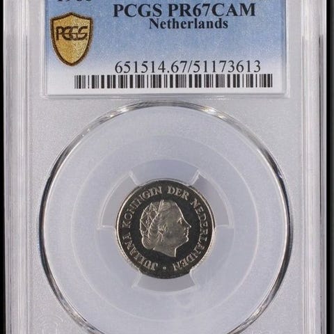 Sjælden Juliana riksdaler 1969 slået i proof. Her er der kun ca. 40 af dem slået. Certificeret af PCGS i PR65CAM. En meget ordentlig kvalitet.