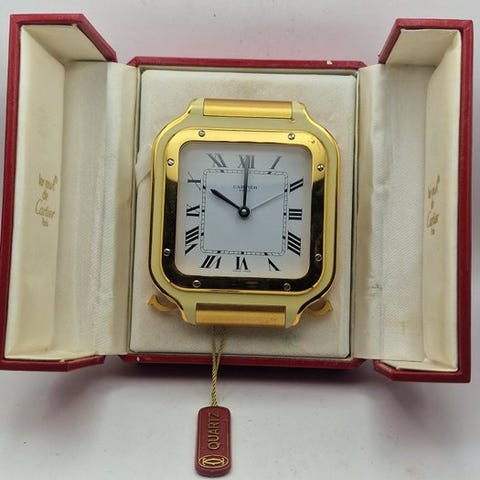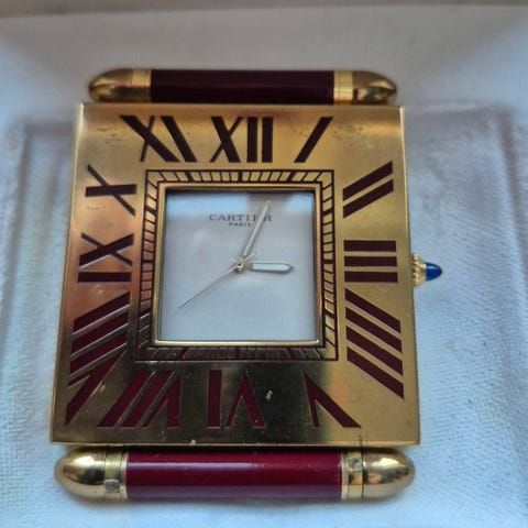 Vintage Cartier metal bordurur-ur, Paris, kvartsur, estimeret periode 1980–1990, ca. 10 cm kvart, vægt 1 kg, ét emne, i dårlig stand med sprækker og skader. Klik på den blå "gå til varen" knap, for at købe eller byde på denne vare. Den samlede pris vil blive vist inden du afgiver dit bud.