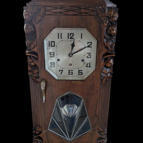 Elegant bordur i cappuccino-stil, fremstillet i Tyskland i begyndelsen af 1900-tallet af det historiske hus Junghans. Den har en messingskasse med fin dekoration og sølvfarvede detaljer, et originalt øverste håndtag og en urskive med romerske tal.