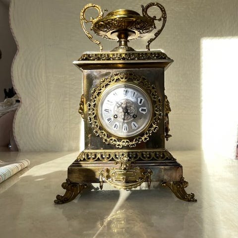 Denne smukke mekaniske bordsur med månefase er et sandt blikfang for entusiaster af klassiske urværker og traditionelt håndværk. Uret er udført i et rigt dekoreret træskab med messingornamenter og udstråler den tidløse charme fra den engelske klokkemagertradition.