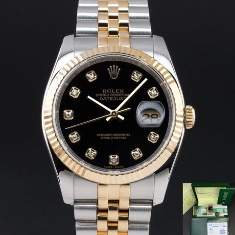Denne Rolex er i stål og Rolesor, hvilket betyder en kombination af rustfrit stål (til kassen og de ydre led) og 18k guld til kransen, kronen og de indre led af armbåndet.