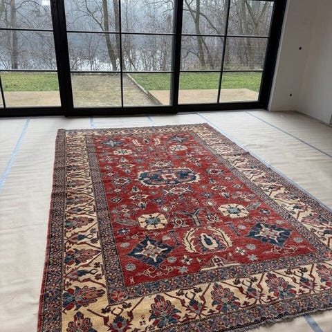 Dette tæppe er et traditionelt håndknyttet mesterværk, hvor hver knude er omhyggeligt og enkelt knyttet ind i tæppets struktur.